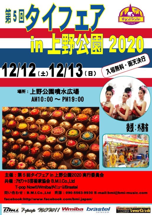 第5回タイフェアin上野公園2020 気になるイベントをシェア Share on X (Twitter) Share on Facebook Share on Email Share on SMS公式ページ日程2020年12月12(土)13(日)第5回タイフェアin上野公園2020雨天決行時間 10:00~19:00会場上野公園竹の台広場竹の台広場 (噴水前広場)アクセス「竹の台広場の行き方」入場料無料主催Bmi駐車場を予約する「上野公園付近の予約のできる駐車場」の一覧気になるイベントをシェア Share on X (Twitter) Share on Facebook Share on Email Share on SMS