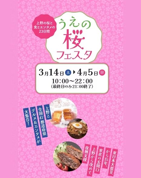 上野で3月に開催されるグルメとステージ企画のイベントとして、上野恩賜公園:噴水広場・袴腰広場・不忍蓮見広場(蓮見デッキ前)を会場に実施されるうえの桜フェスタは、公式に発表されているご当地グルメ企画やライブステージなどが行われるイベントです。